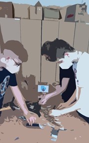 Diese wurden in unserer Schulwerkstätte mit der Stichsäge ausgeschnitten, anschließend mit dem Handschleifgerät poliert, Ecken und Kanten wurden mit Feilen nachbearbeitet. Die vorgezeichneten Kontouren wurden von den Schülern mit verschiedenfärbigen Kronkorken ausgestaltet, sodass die jetzigen Farben und Formen zustande kamen.
